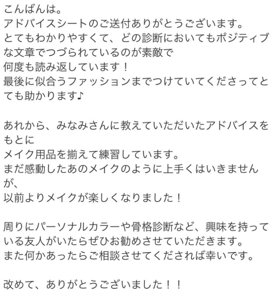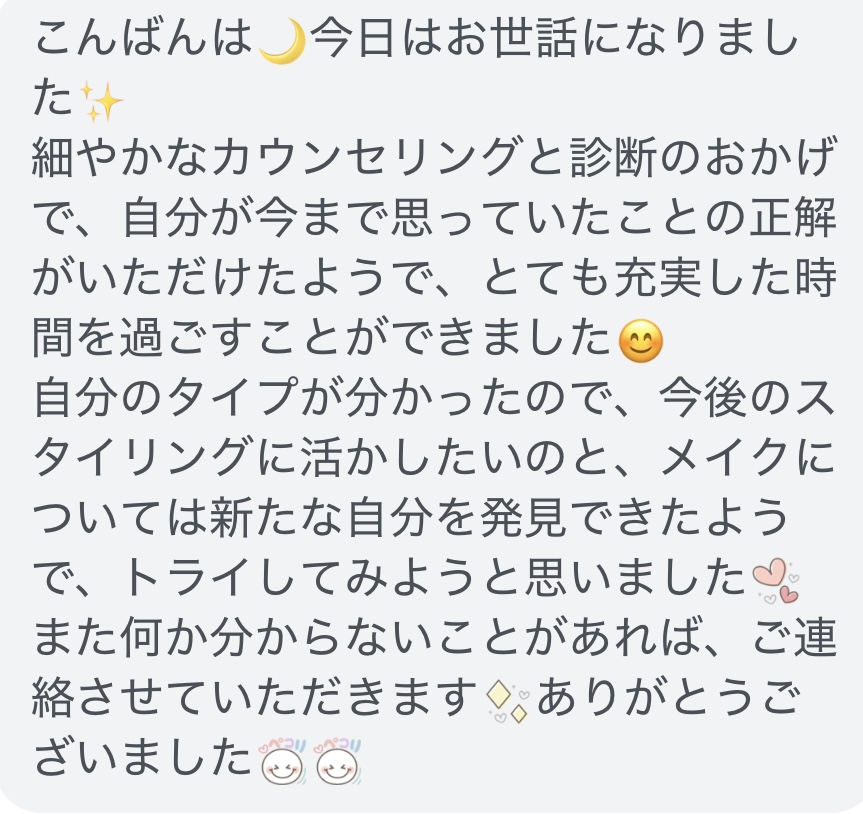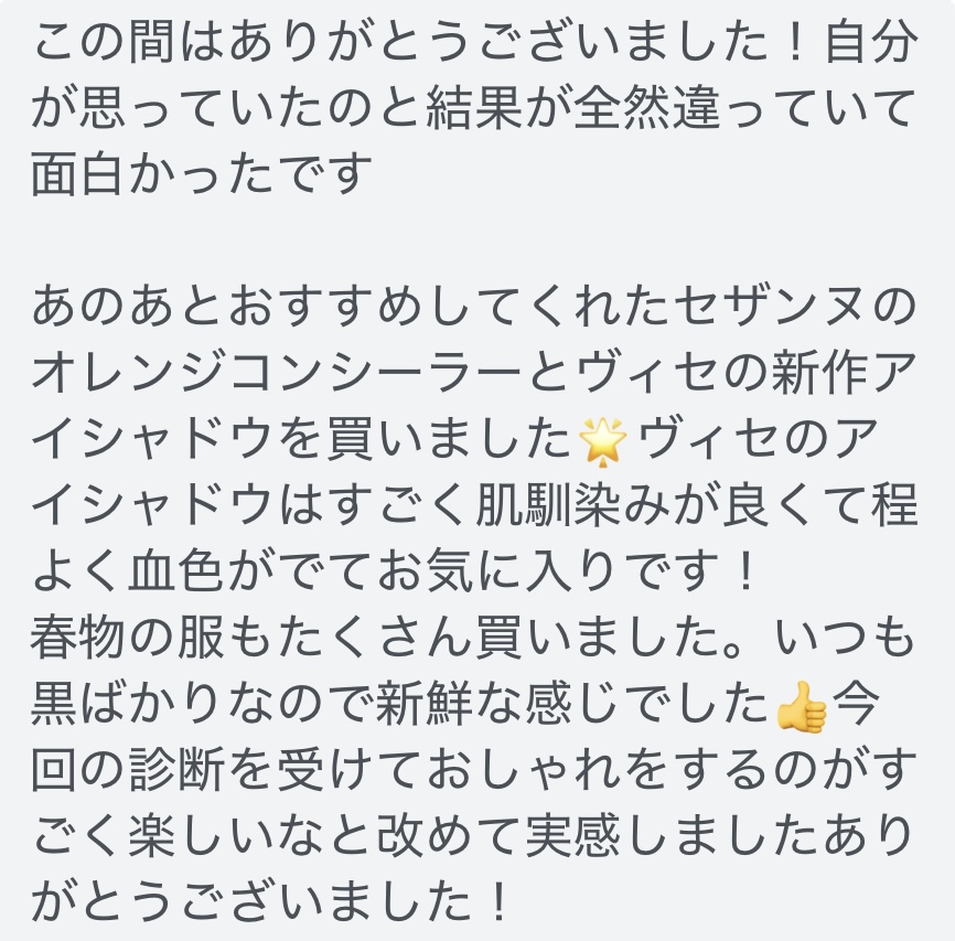 30代になり似合う色が分からなくなっていたけれど、パーソナルカラーを知って今まで買わなかった色の服や化粧品に挑戦したいと思いました。
